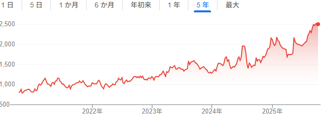 過去5年で+200%超え。成長は順調です。