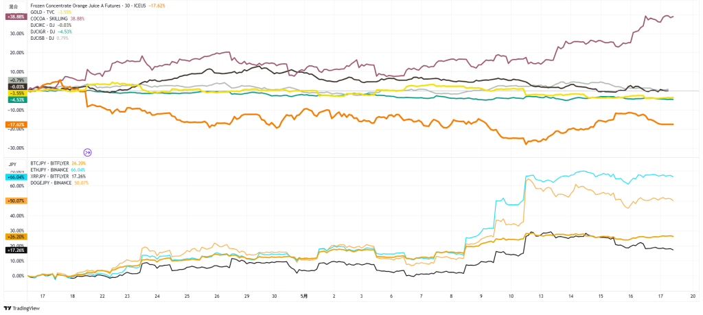 仮想通貨やオレンジジュースなどのチャート:下落です
