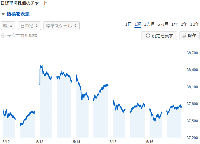 今週の日経平均は、38494円が最高値で、最安値が37417円の、1100円くらいの値動きでした。