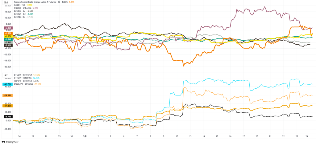 だから「債券・株からビットコイン・オレンジジュース・ココアへ流れ?」のほうがリアルな感じはありますけれど。なんか嫌だな。