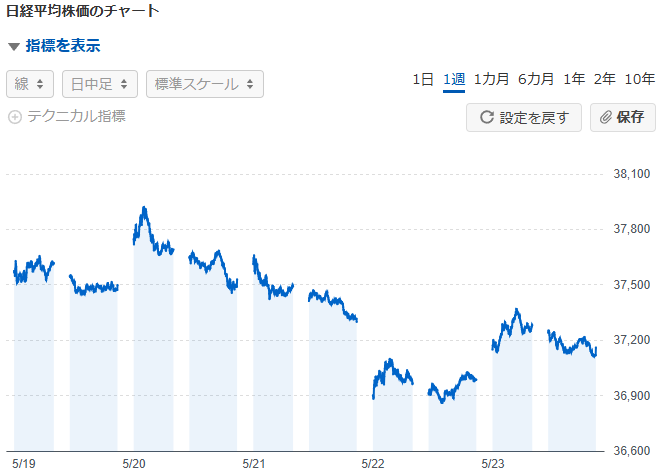 今週の日経平均は、37921円が最高値で、最安値が36855円の、1100円くらいの値動きでした。