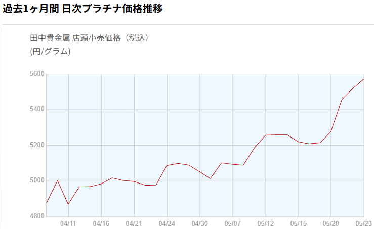 引用元:田中貴金属 プラチナ価格 過去1ヶ月日次推移グラフ https://gold.tanaka.co.jp/commodity/souba/d-platinum.php 画像は引用元の画面キャプチャ