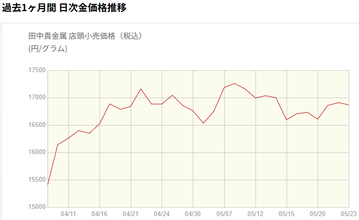 引用元:田中貴金属 金価格 過去1ヶ月日次推移グラフ https://gold.tanaka.co.jp/commodity/souba/d-gold.php 画像は引用元の画面キャプチャ