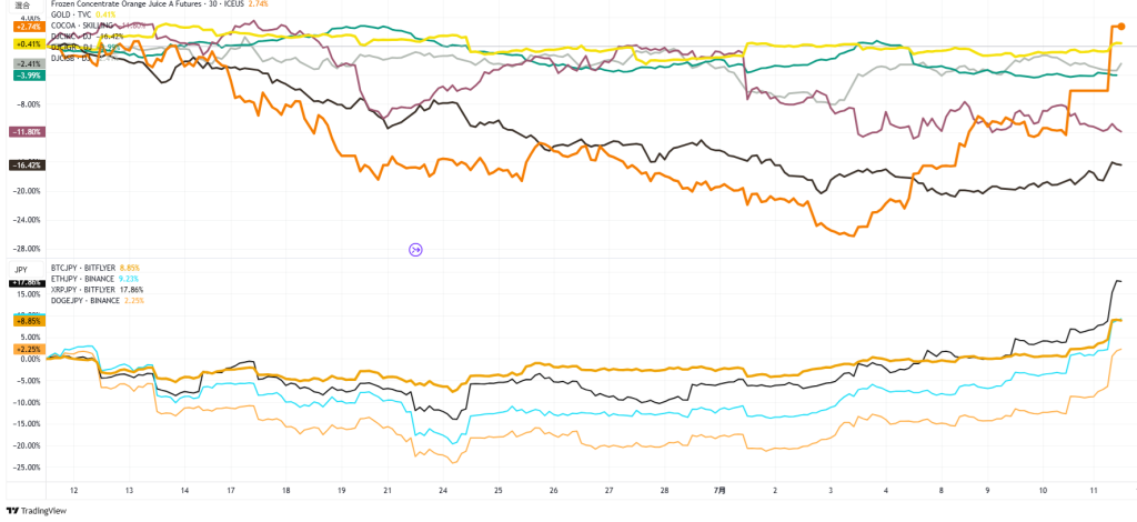 仮想通貨やオレンジジュースなどのチャート:食料落ちてる