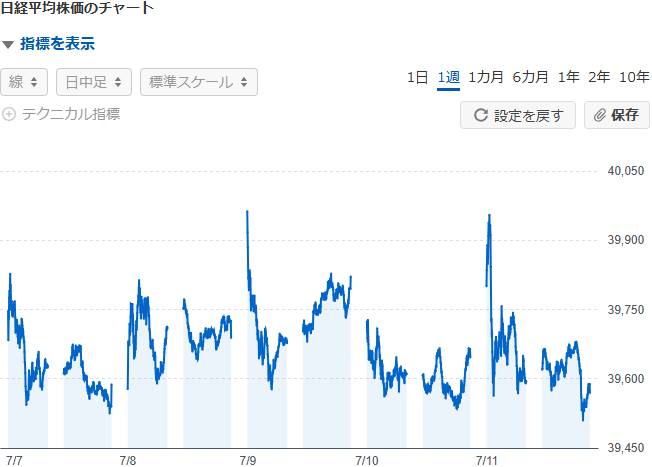 今週の日経平均は、39971円が最高値で、最安値が39497円の、500円くらいの値動きでした。