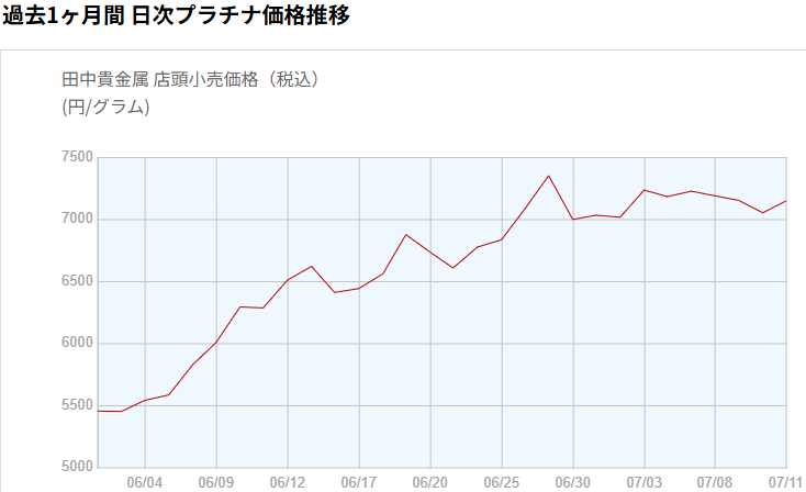 週間の最高値は3日に7234円/gをつけたのが最高値で、その直前の2日に7015円/gをつけたのが今月の最安値。今週はその範囲内です。