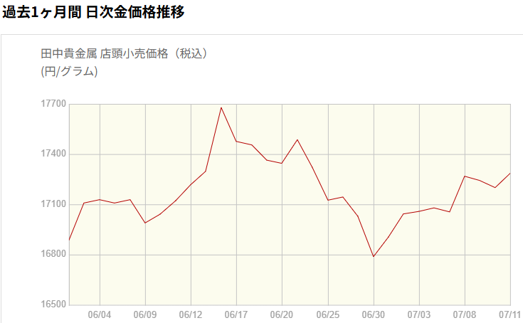 7月の最高値は7月11日の17285円/gでした。プラチナにトレンドが移ったか、と思ったら、また金なんですかねえ。なんかよく分からない。