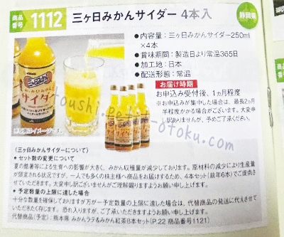 優待について調べていたときに目に止まったのが、このみかんサイダーのセット。去年は6本セットでしたが、今年は4本セットになっていました。