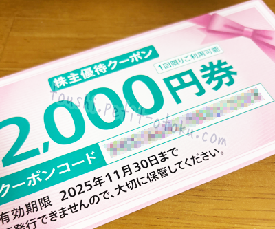 なお、優待クーポン併用の場合、優待カタログで都度購入10%OFFの金額から更にクーポンで2000円OFFになります。