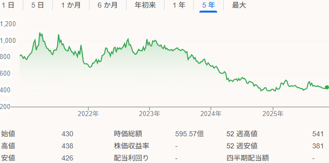 一応優待がある間は1000円台もあったんですが、優待が改悪されてから株価はもう下がる一方です。最近はようやく株価が下げ止まってきたなあ、という感想。