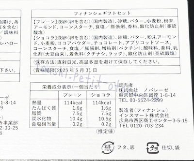 フィナンシェは公式サイトを見ると「焦がしバター」とありますが、箱裏面の成分表示では「プレーン味」とありますので、この記事内ではプレーン味で統一しますね。