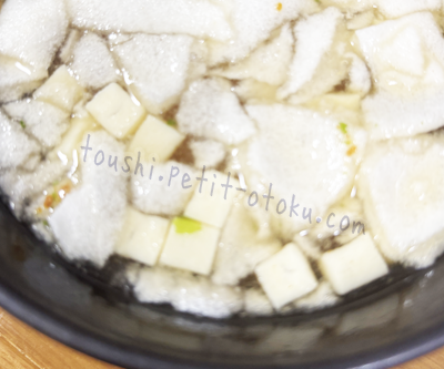 中はインスタントのお味噌やとうふ。ちなみにネギなどの具材も少しあります。