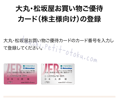 パソコン版だと『ガイド』→でてきたメニューから『お客様情報の変更』→『大丸・松坂屋お買い物ご優待カード(株主様向け)の登録』と進んで、でてきた入力フォームにカード番号とセキュリティコードを入力して登録完了。