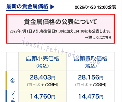 田中貴金属の場合、毎日9時半と14時に価格公表を行います、と公表があったのが2025年6月頃。