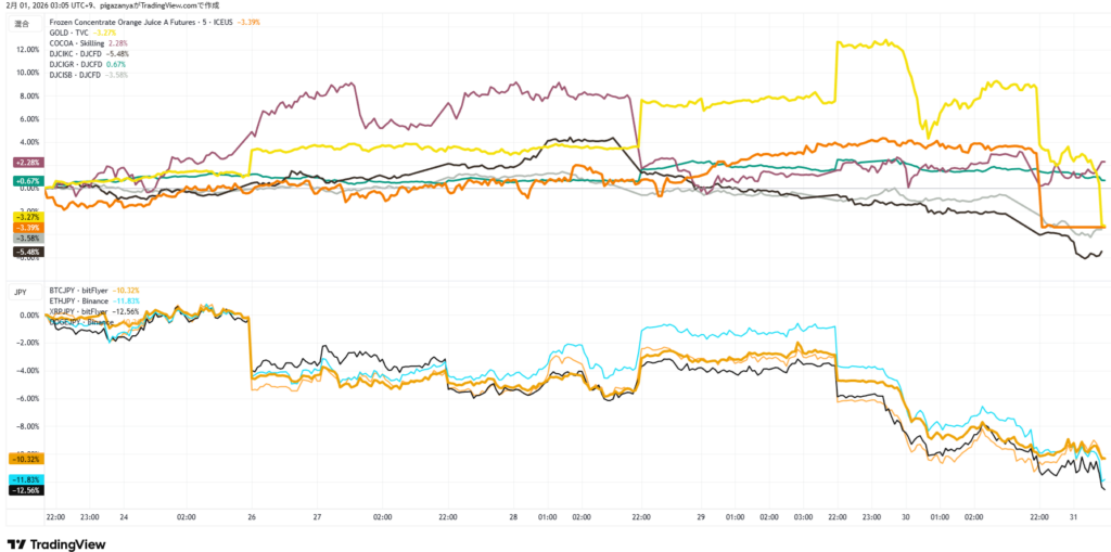 仮想通貨やオレンジジュースなどのチャート