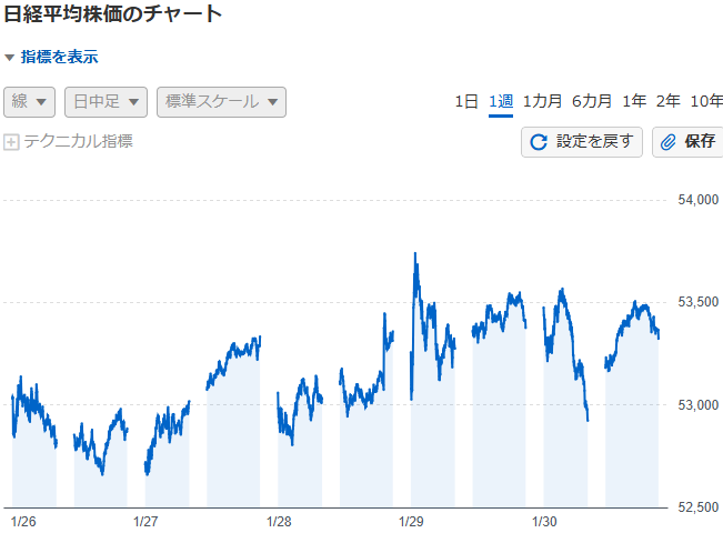 今週の日経平均は、53742円が最高値で、最安値が52637円の、1100円くらいの値動きでした。
