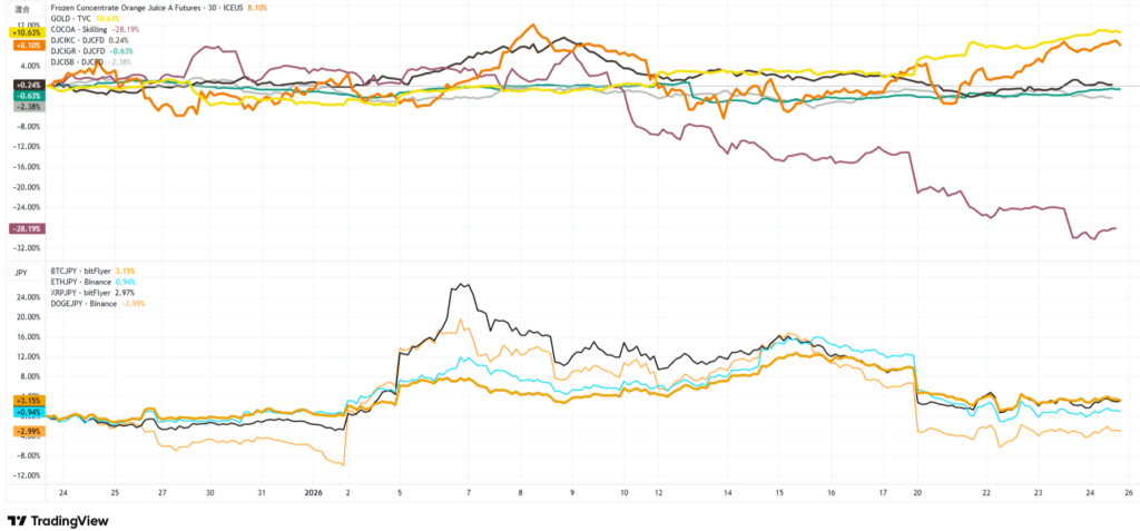仮想通貨やオレンジジュースなどのチャート