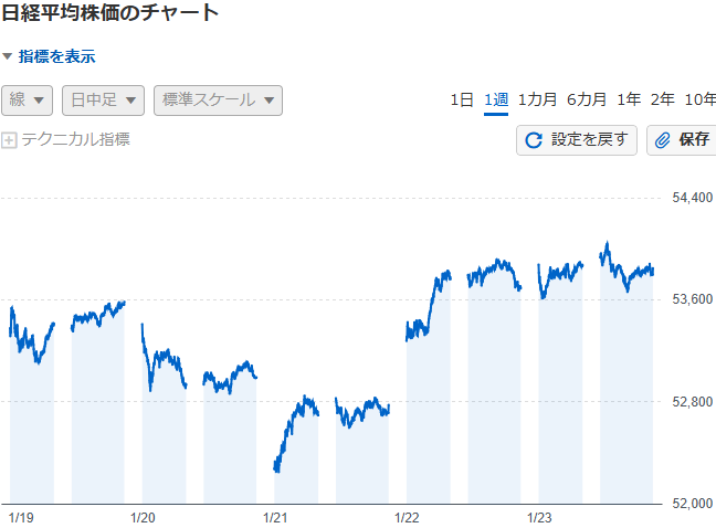 今週の日経平均は、54050円が最高値で、最安値が52194円の、1900円くらいの値動きでした。