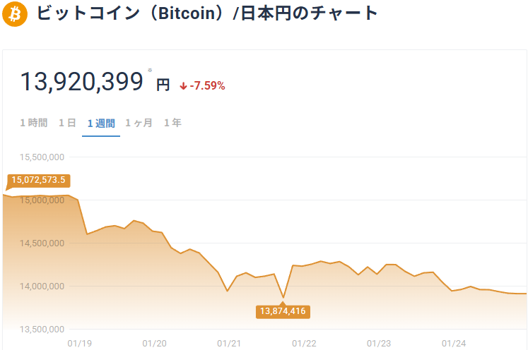 先週とは打って変わって、ビットコインが調子悪そう。