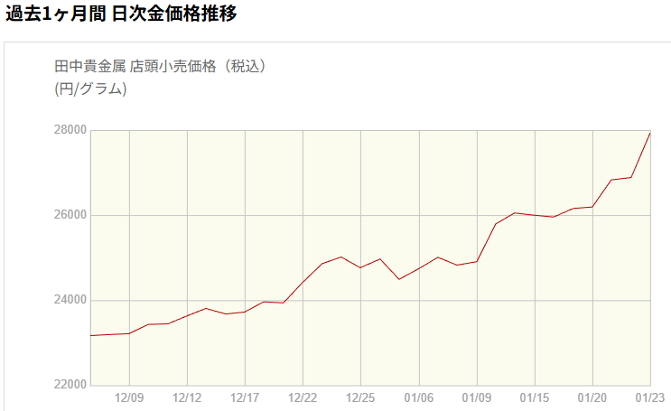 田中貴金属のデータでは、23日金曜日に27929円/gをつけています。これが上の表の最高値更新。