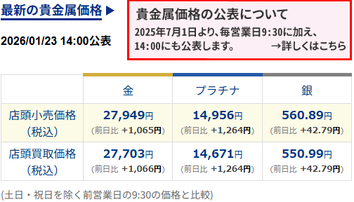 田中貴金属は14時にも価格を発表しており、そちらでさらに高く27949円/gという。