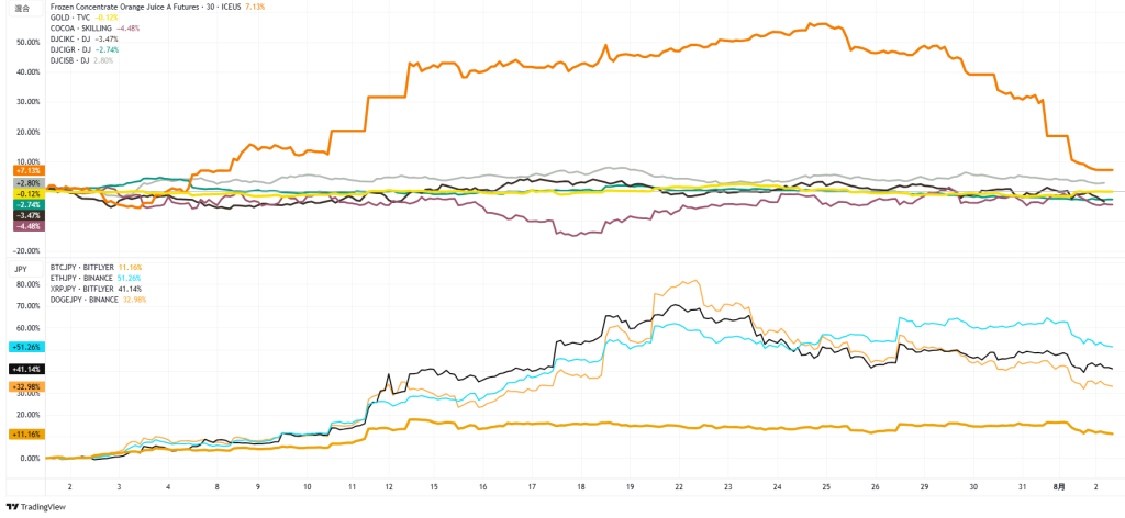 仮想通貨やオレンジジュースなどのチャート:静かな