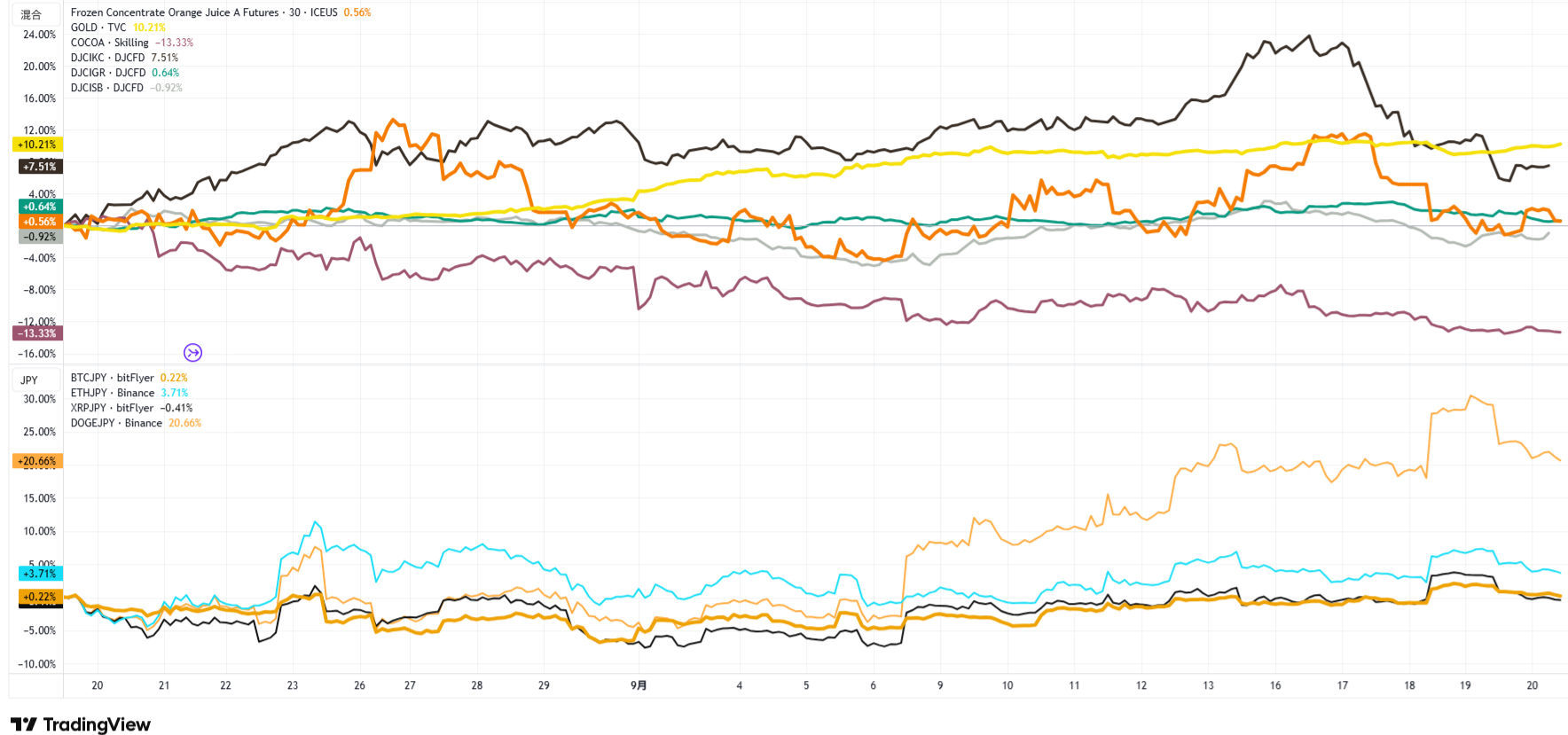 画像出力元:TradingViewより、過去1ヶ月程度の各商品のグラフ