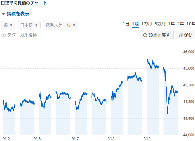 今週の日経平均は、45852円が最高値で、最安値が44495円の、1300円くらいの値動きでした。