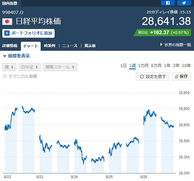 先週29000円台に乗ったので、それが続くかと思ったら反動で落ちた感じ。さらにそれにジャクソンホール会議待ちの様子見で落ちたなぁって感じですね。