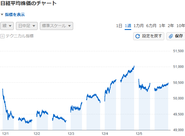 今週の日経平均は、51028円が最高値で、最安値が49215円の、1800円くらいの値動きでした。