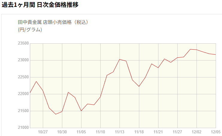 月が変わったとたんまた最高値更新。1日に23323円/gという高値更新。