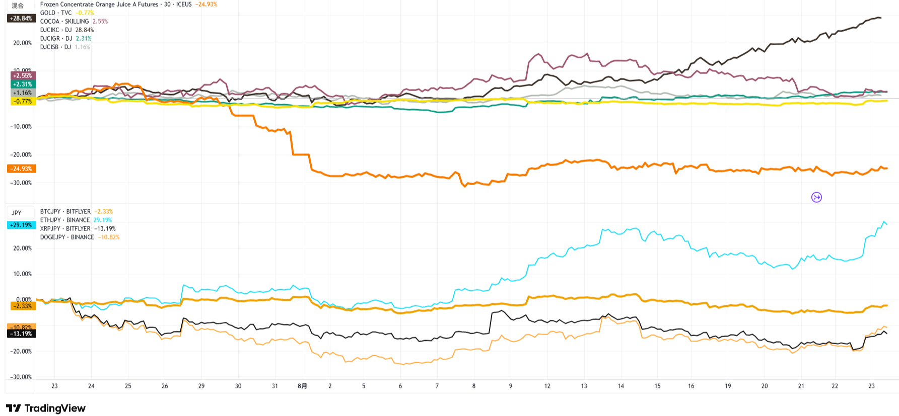 画像出力元:TradingViewより、過去1ヶ月程度の各商品のグラフ