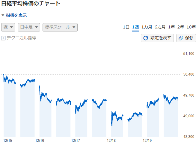 今週の日経平均は、50432円が最高値で、最安値が48643円の、1800円くらいの値動きでした。