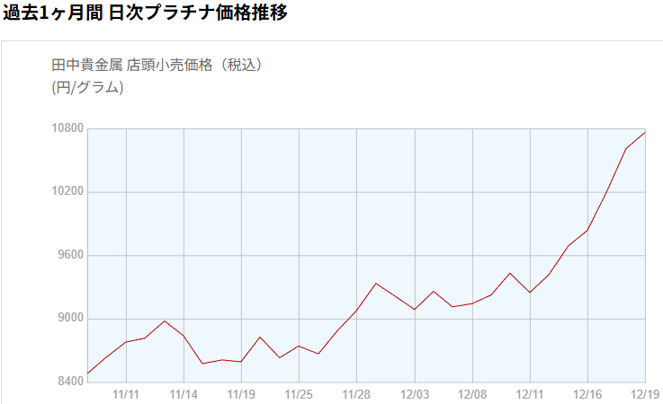 17日水曜日に10191円/gをつけ、さらに19日金曜日に10761円/gと最高値更新。