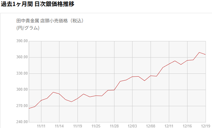 全く銀を見ていなかったのですが、12月1日に315.48円/g。前日の11月28日には299.31円/gだったというのに。