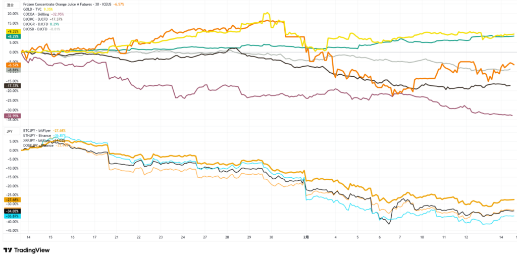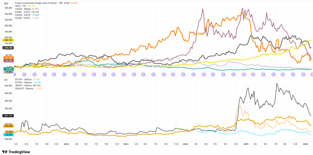 仮想通貨やオレンジジュースなどのチャート