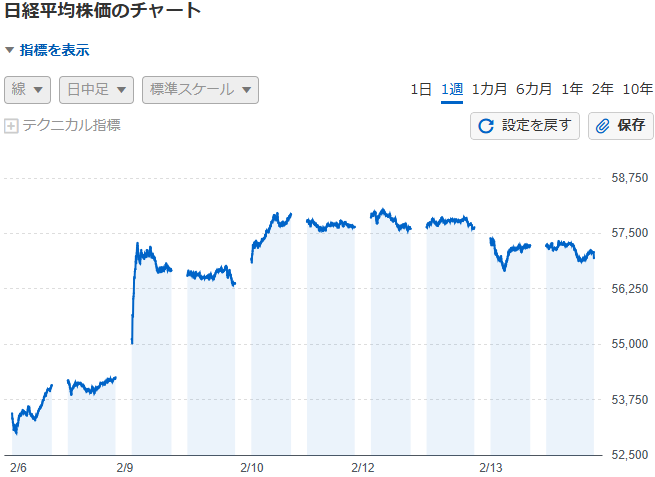 | 先週金曜日(2/6)の終値は54253円です。この日の安値が週間の最安値です。 | ||||
