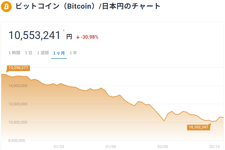 いくつかのアナリストの予想を見ると、5.5万ドル(14日お昼時点で830万円程度)まで下げるとか、5万ドル(760万円程度)まで下げるとか。本人の感覚からすれば1000万円は割るかどうかビミョーなところ。ただ、目安として800万円までは下げるかもしれないので、それまでにまた買い足す準備はしておきたいところです。